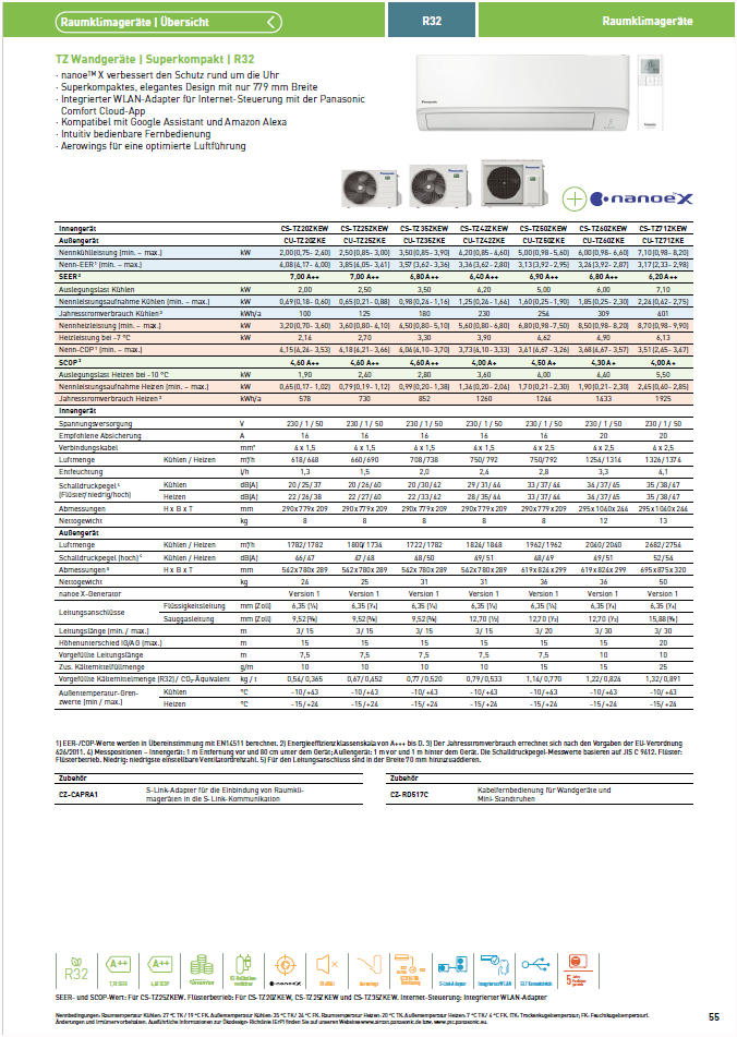 Dieses kompakte Wandgerät mit der sehr geringen Breite von 799 mm (799mm betrifft alle Geräte unter 5 kW) verwendet das umweltfreundliche Kältemittel R32. „Aerowings“ und Feinstaubfilter (PM2,5) sorgt für optimierte Luftführung sowie eine gesunde und saubere Raumluft. Eine umfangreiche Palette an Standard-Inverter-Modellen sorgt für flüsterleise 20 db(A) (TZ20, TZ25, TZ35) und hohe Energieeffizienz. Es können lange Leitungslängen (von 15 bis 30 m je nach Modell) verwendet werden.