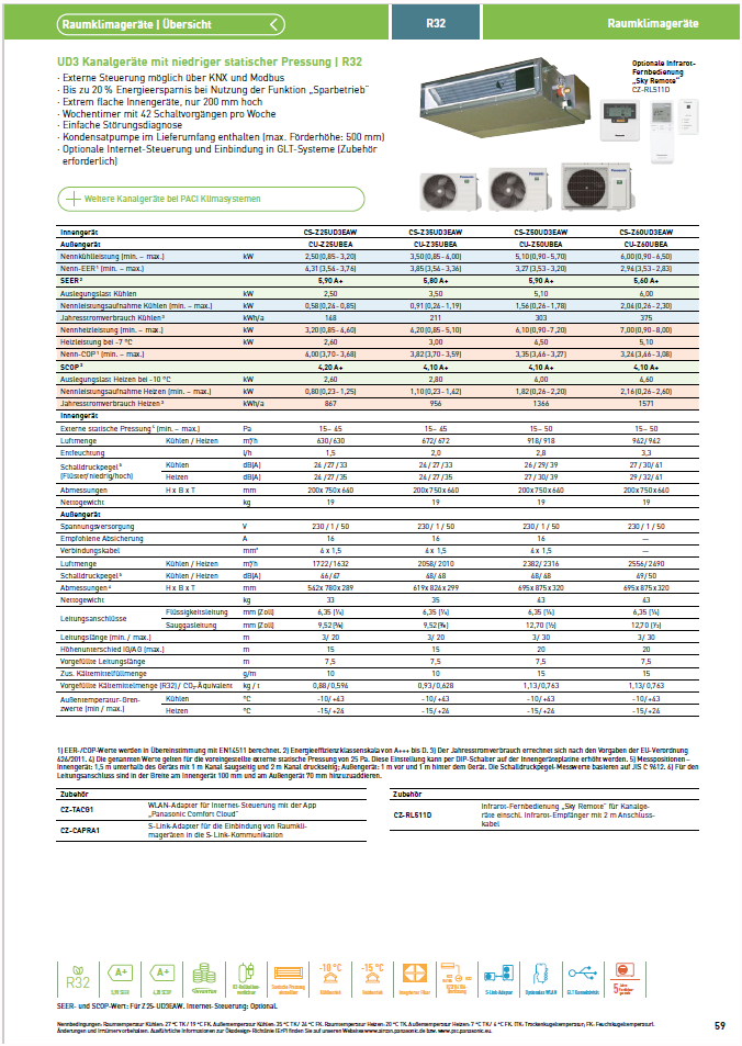 Eingesetzt wird das umweltverträgliche Kältemittel R32. Im "Sparbetrieb" ist eine Energieersparnis von bis zu 20% möglich. Bei den extrem flachen Innengeräten mit einer Höhe von 200 mm ist die Kondensatpumpe im Lieferumfang enthalten (max. Förderhöhe: 500 mm). Über spezielle Interfaces von Panasonic für die Bussysteme KNX, Modbus und EnOcean können die Kanalgeräte auch in Gebäubeleitsysteme eingebunden werden und erleichtern so die zentrale Steuerung der Systeme. (Zubehör erforderlich)
